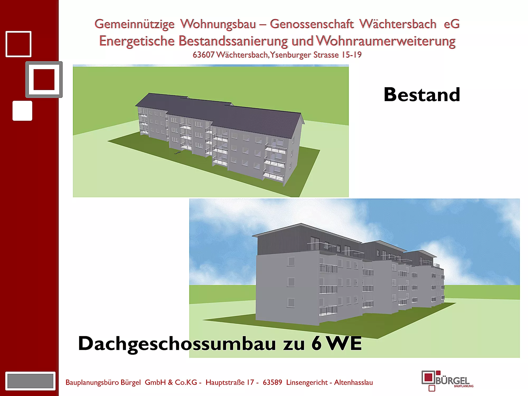 In Wächtersbach entstehen derzeit in der Ysenburger Straße 15 – 19 sechs neue Wohnungen. Gebaut werden diese von der „Gemeinnützige Wohnungsbau-Genossenschaft Wächtersbach eG“. Dies geschieht durch den Ausbau des Dachgeschosses in Form eines Staffelgeschosses.