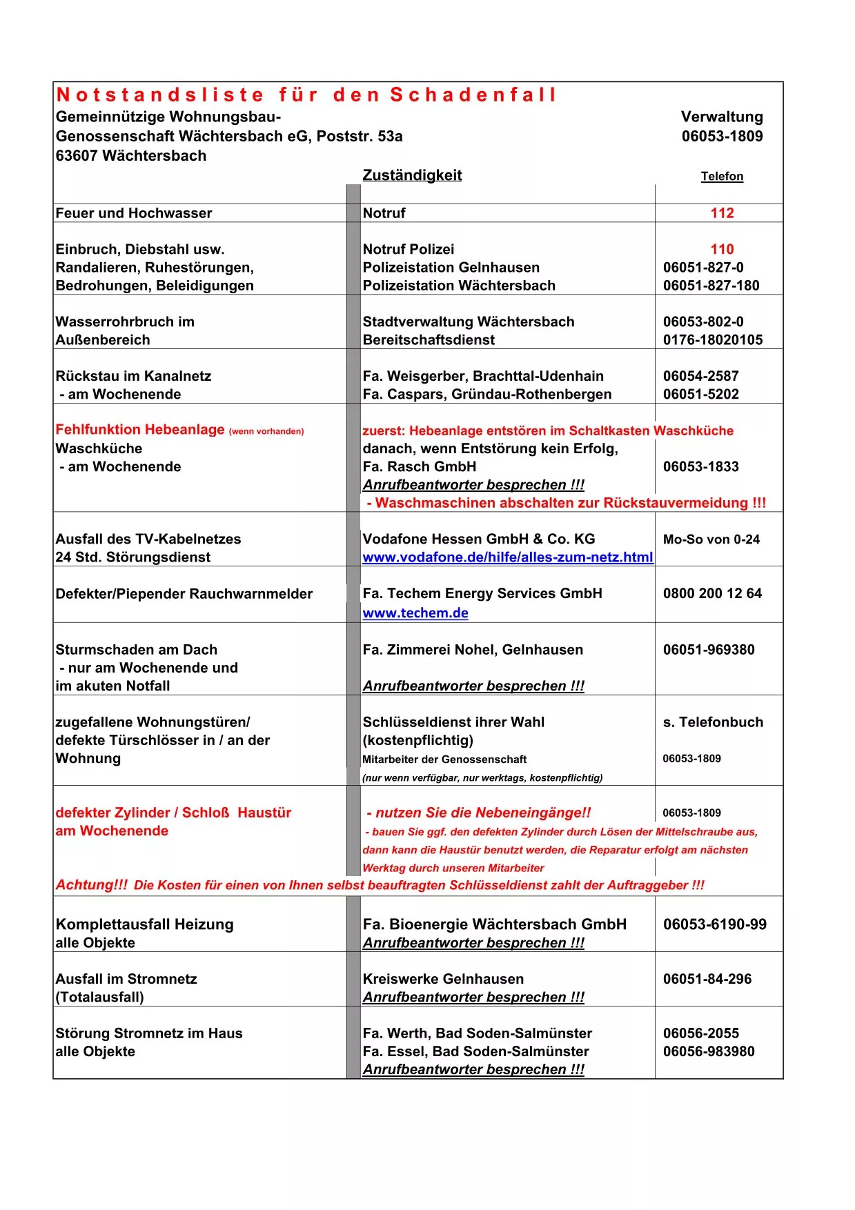 Montag bis Freitag sind Schäden bitte an unsere Verwaltung zu melden